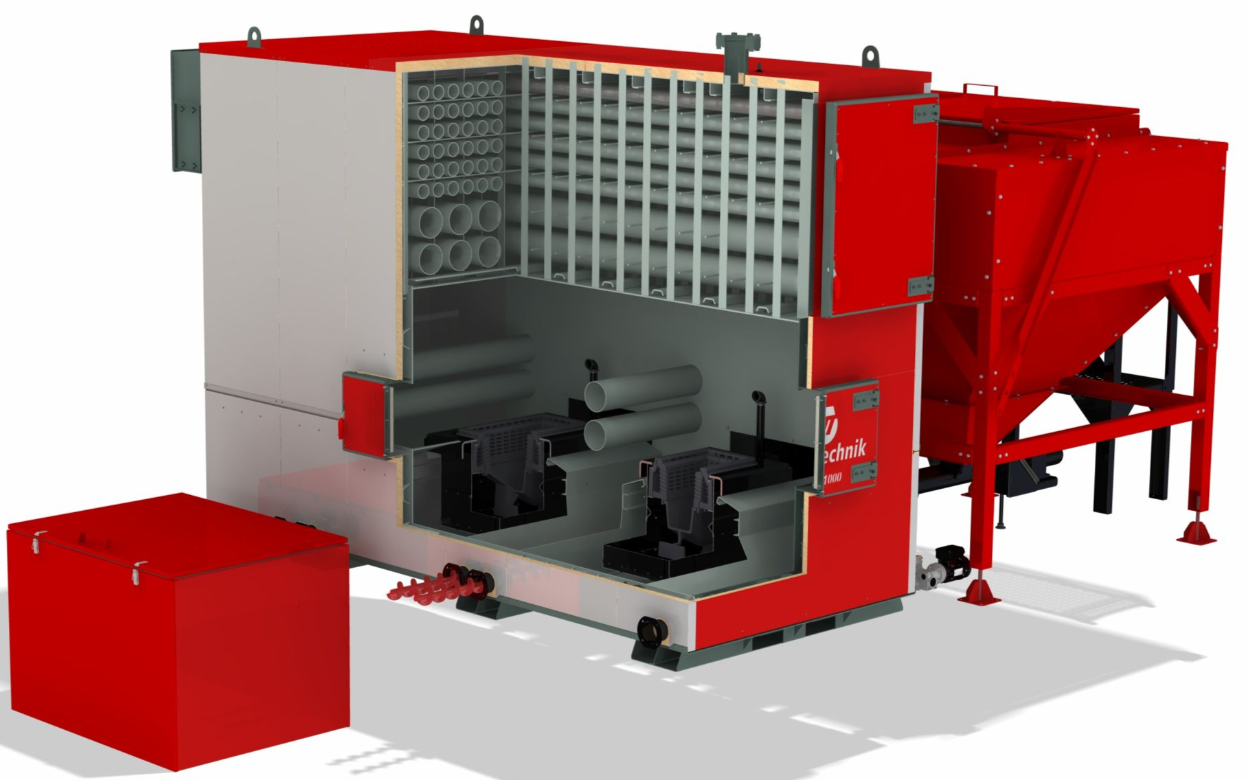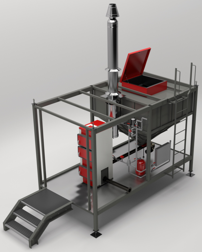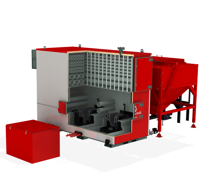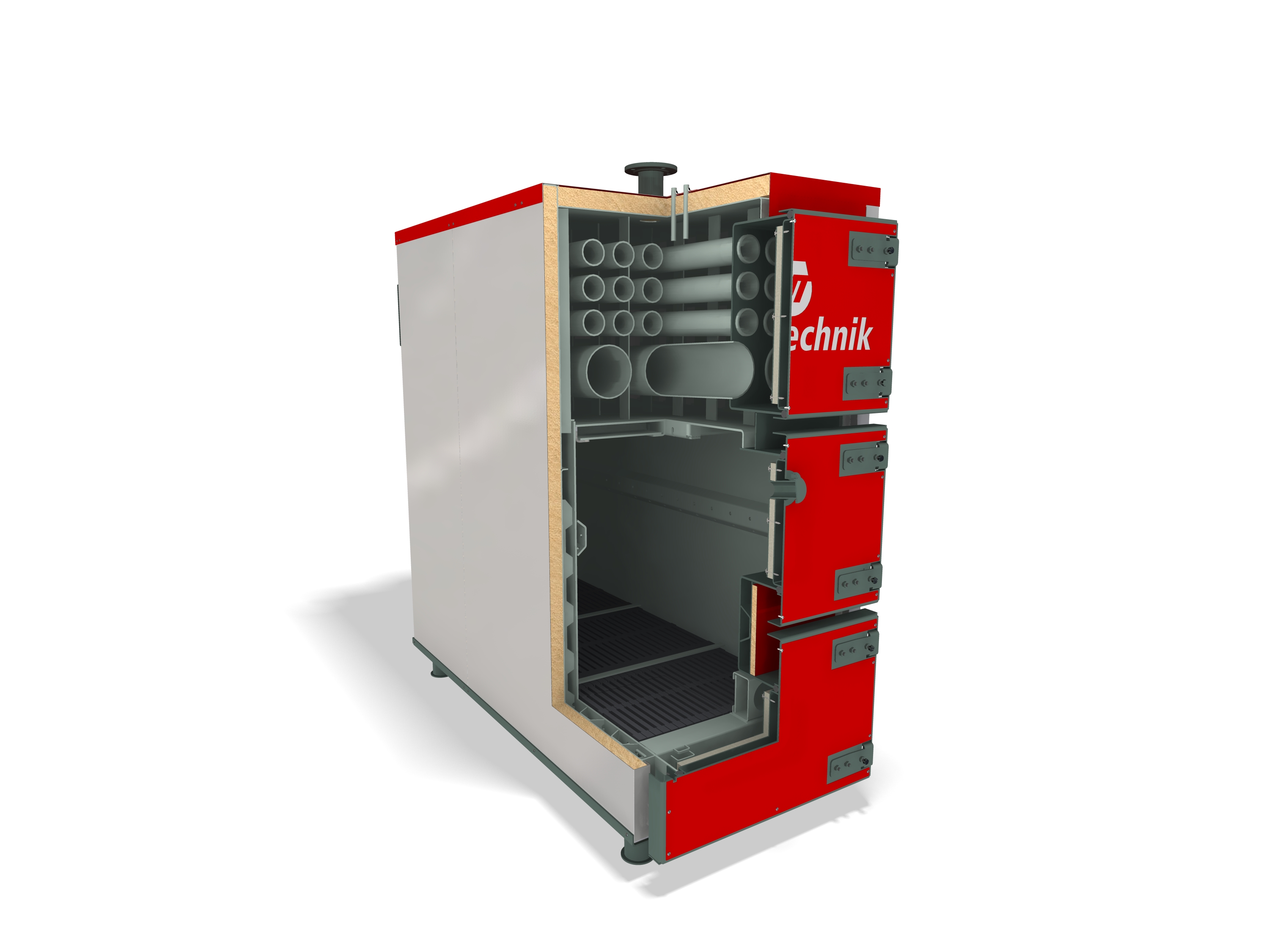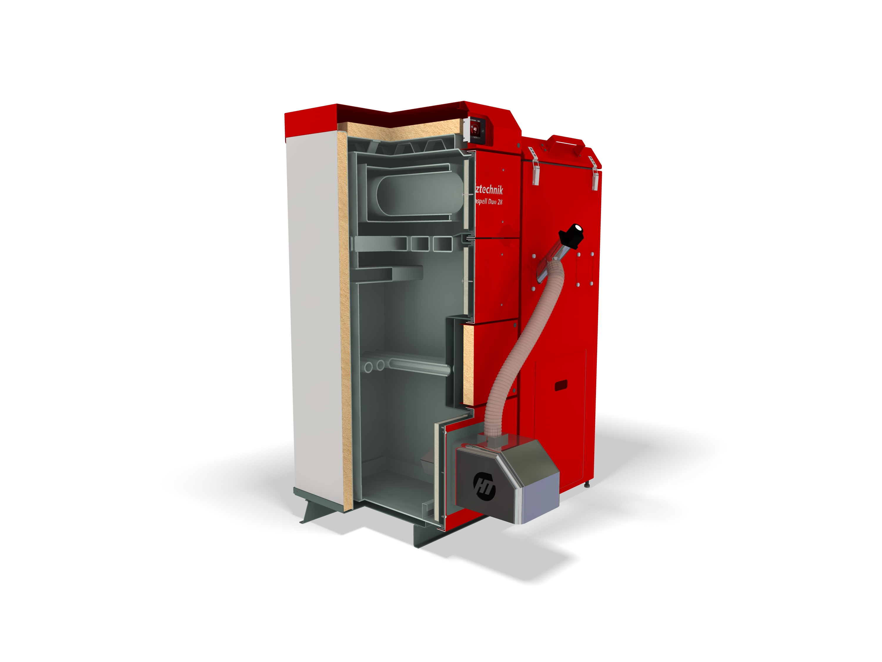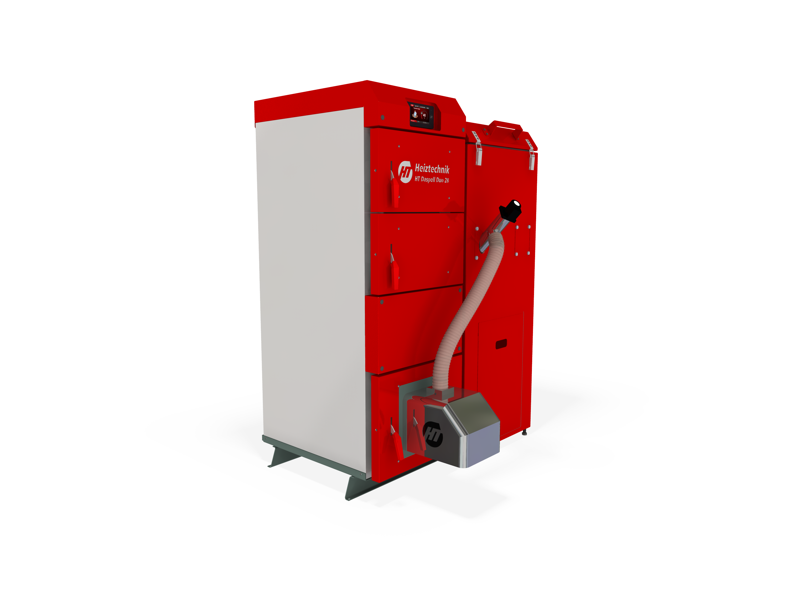 Топливо автоматически подаётся в зону горения (уголь, пеллеты, опилки+уголь).